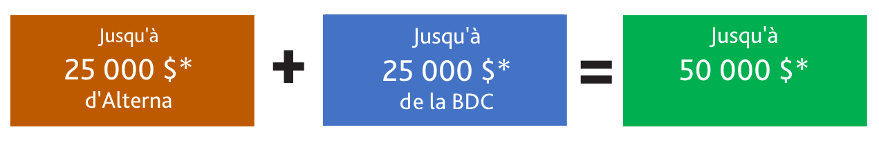 * Les prêts de la Caisse Alterna et de la BDC peuvent atteindre 25 000 $ chacun. Ce montant sera déterminé au cas par cas et n’est pas garanti.
